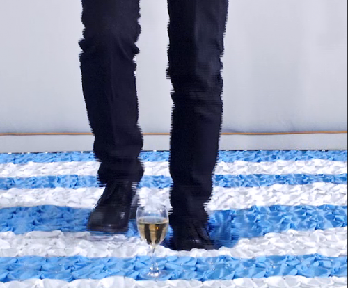 她把裝滿杯子的水放在床墊上。她脫下鞋子,踩在離玻璃不到10厘米的床墊上,然后開始跳動。