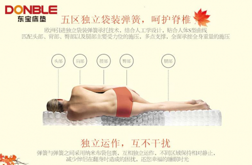 東寶乳膠床墊符合人體工程學(xué)九個(gè)部分的設(shè)計(jì),根據(jù)人體頭、頸、肩、肋、腰、椎尾、臀、腿、足九個(gè)受力部位的不同特點(diǎn),采用不同性能參數(shù)和不同制造工藝的獨(dú)立袋裝彈簧,使其完全適應(yīng)人體自然曲線,緊密無(wú)縫支撐,完全放松,減壓,保護(hù)脊椎監(jiān)測(cè),促進(jìn)深度睡眠。