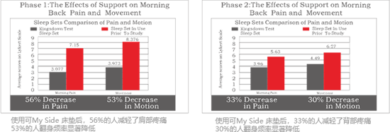 ■ 研究者做了兩類存在睡眠問(wèn)題人群的研究,發(fā)現(xiàn)他們的使用My Side床墊后疼痛有明顯減輕的效果,同時(shí)還可通過(guò)減少翻身的頻率,減少睡眠中被打擾的次數(shù)。