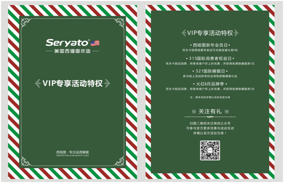 “愛您一輩子”,是西婭圖當下要做的事,亦是未來堅持做的事。未來已來,感恩常在!佛山市西婭圖家具實業有限公司為更進一步地表達對客戶的深切關愛,故特別贈予忠實客戶“VIP專享活動特權卡”,讓親愛的消費者在2020年也能繼續感受到來自西婭圖品牌的滿滿愛意: