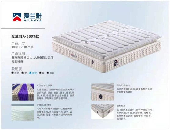 睡眠質量的好壞與床墊息息相關,床墊的質量離不開通透性、減壓性、支撐度、服貼性、床面張力等指標,愛蘭雅床墊采用九區全獨立彈簧,完美承托人體的頭部、腰部、腿部,實現長睡不腰疼的愿景。其“X-90”結構雙面面孔與Z34納米冰絲面料,抗菌抑菌,又時刻保持干爽透氣,其親膚保暖、吸濕排汗性能在國內同類品牌中處于領先位置。