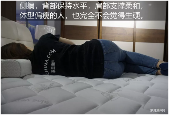 人體大字躺,可以明顯感覺到踏實平穩。同時,身體跟床墊之間的呈現出高度的貼合感,即使胳膊腿這種身體細部也沒有空隙。床墊睡感柔和,但沒啥包裹感,所以睡起來并不會覺得悶熱。怕冷怕熱的人適應起來都毫無壓力。側躺,背部保持水平,肩部支撐柔和。體型偏瘦的人,也能被安排得明明白白,完全不會覺得生硬。