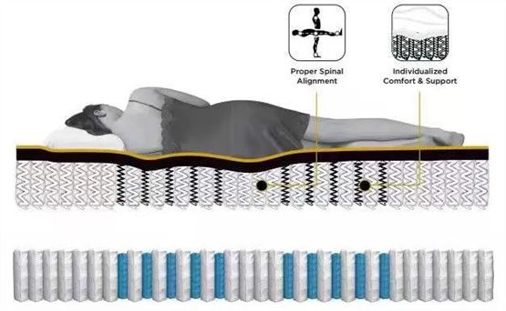 不僅如此,金可兒在產品設計理念上,力求達到精準承托,柔和響應。一方面,通過支撐系統的材料和工藝設計,使不同重量的身體部分得到對應準確的支撐,從而保持身體的脊椎正常生理曲線,達到舒緩壓力,幫助脊椎在睡眠中放松。另一方面,再通過舒適墊層的材料和工藝設計,使人體壓力的傳遞得到柔和的分散和傳導,使身體在靜止和翻動時都較輕松自然,減省額外壓力,從而保持睡眠狀態的有效延續。