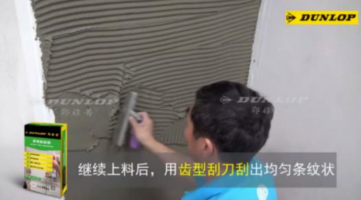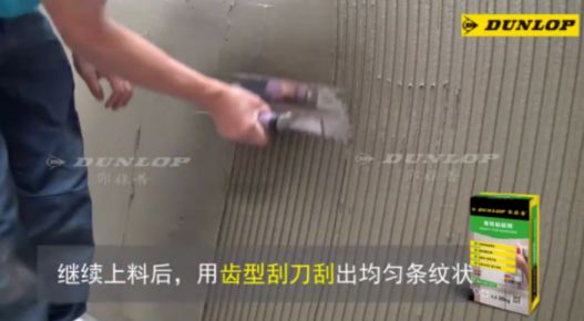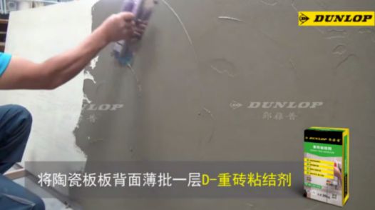 首先將墻面使用D-重磚粘結劑薄批一層,繼續上料后,用齒型刮刀刮出均勻條紋。將陶瓷板板背面薄批一層D-重磚粘結劑,繼續上料后,用齒型刮刀刮出均勻條紋狀。