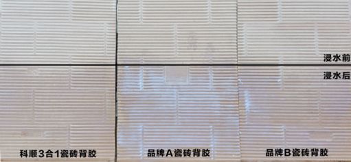 浸水測試后,科順3合1瓷磚背膠無明顯發白、無明顯剝離,其他品牌背膠發白失效、有不同程度的剝離。