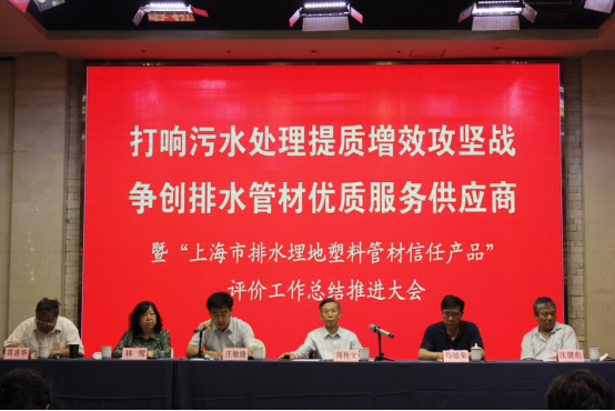2019年6月12日下午上海市排水埋地塑料管材信任產品評價委員會在華納國際會議中心召開了《打響污水治理提質增效攻堅戰,爭創排水管材優質服務供應商》暨“上海市排水埋地塑料管材信任產品”評價工作總結推進大會。