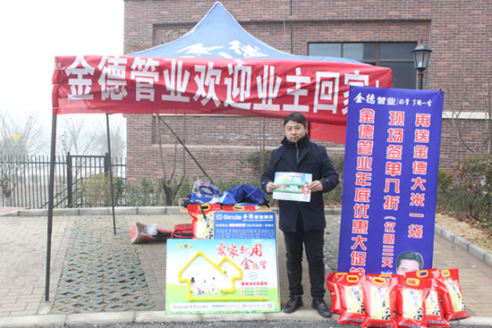 金德管業集團池州市總代理談勝就是人群中最忙碌的那位。在分公司業務員的協助下,他忙著搭建帳篷、安裝展桌;支架展板、整理單頁;擺放貨物、搬運禮品......寒風凜冽,絲毫吹不散他們的干勁和激情。很顯然,今天他們準備大戰一場!