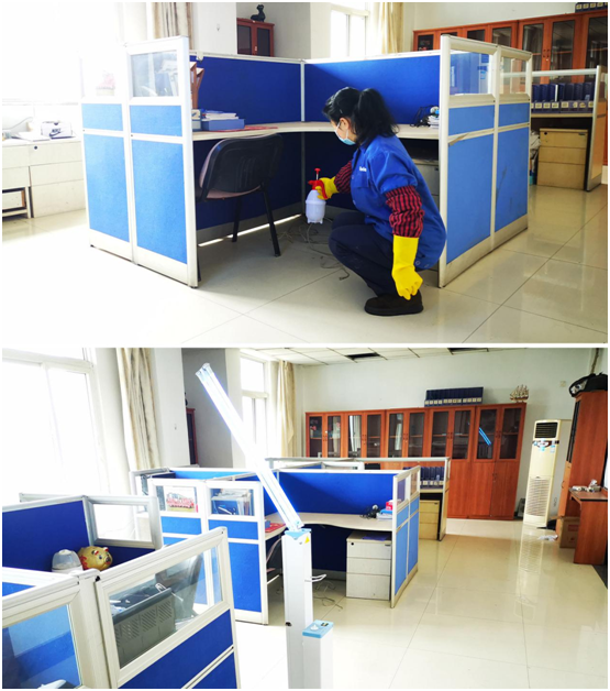 辦公室里,保潔阿姨正拿著84消毒液為我們進行辦公室消毒。將消毒液噴灑于桌面、桌底、椅子、擋板……做到每個角落都不放過,隨后架起紫外線消毒燈,雙重消毒下,讓病菌無處藏匿!