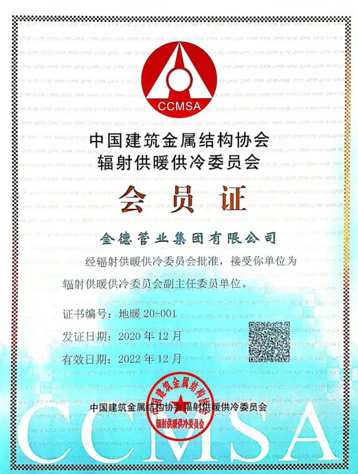 近日,金德管業(yè)集團(tuán)榮獲中國建筑金屬結(jié)構(gòu)協(xié)會和輻射供暖供冷委員會會員證并被評為輻射供暖供冷委員會“副主任委員單位”!