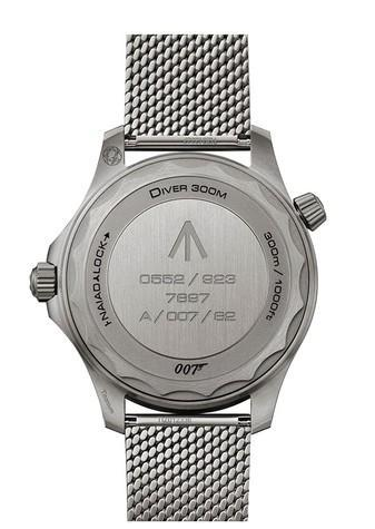 ▲歐米茄海馬潛水300米系列同軸擒縱42毫米大師天文臺007版腕表,搭配鈦金屬表煉,底蓋鐫刻軍隊配發(fā)腕表所編列的數(shù)字。