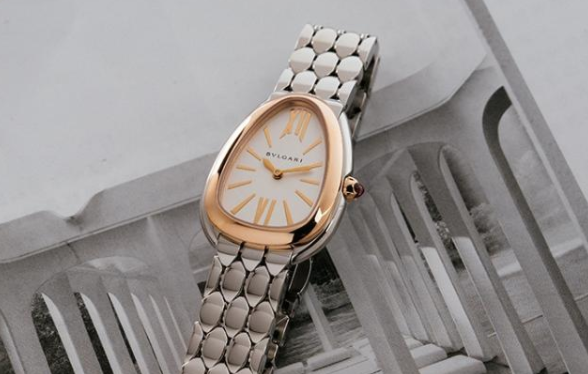 接下來從寶格麗開始,這只寶格麗我覺得是非常棒的作品,今年新的這個Serpenti蛇表,蛇鱗的概念,在它的鏈帶上做得非常細膩,但這只表真的只能說希望你們來店上試試看,戴上它,我有好多朋友,好多客人都是我介紹時,他們可能沒有特別的感覺,可是一戴上去就是,一直拿不下來、一直開始拍照,覺得很百搭,我個人覺得就是全K金,會比較展現出這只表的風格,本來這種女性魅力非常強的,但我覺得它的鋼款半金也是非常優雅。