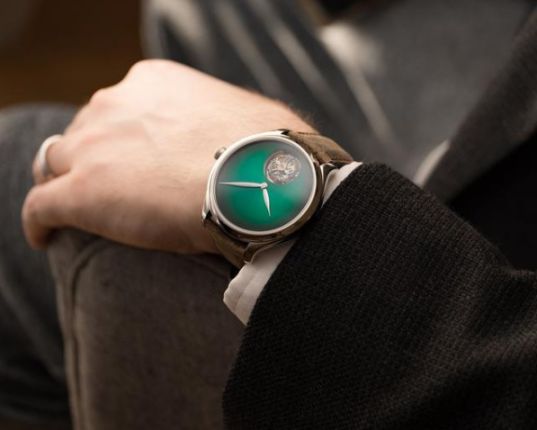 一向擅長化繁為簡的H. Moser & Cie.,特別以深邃充滿生機的宇宙綠太陽紋放射狀表盤,來凸顯陀飛輪的時間精妙,這枚勇創者陀飛輪宇宙綠概念腕表,有著品牌標志性的煙熏表盤設計,整枚腕表上不見任何數字時標或刻度,僅有葉形時分針與位于6點鐘位置的陀飛輪,十分洗鏈。除此之外,為了讓它更符合現代使用需求,分鐘陀飛輪更采以獨立模組化,契合現代潮流趨勢。