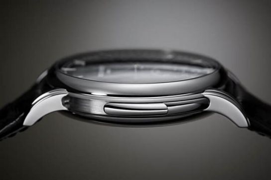 ▲表殼左側的撥桿是用來啟動三問功能的重要零件,此外從側面也可看出機芯屬于薄型設計,令表殼只厚10.18mm,佩戴在手上不會感到沉甸甸的。