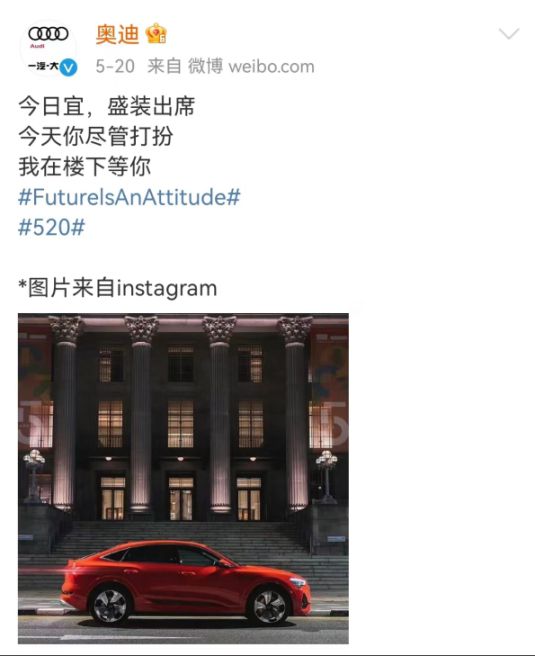 奧迪官博的日常都是“今日宜,XXX”的固定模板?!敖袢找?,開始充電”、“今日宜,銘記”、“今日宜,看透”……圍繞著這個(gè)形式介紹不同產(chǎn)品和品牌活動(dòng)。
