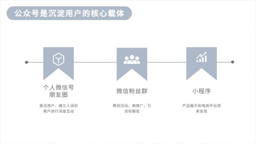 例如,公眾號(hào)是沉淀用戶的核心載體;但要激活用戶、建立人設(shè)和用戶進(jìn)行深度互動(dòng),則需要借助個(gè)人微信號(hào)與朋友圈;微信粉絲群用來策劃活動(dòng)、做推廣,引流和裂變;小程序則作為產(chǎn)品展示和電商平臺(tái)用來變現(xiàn)。