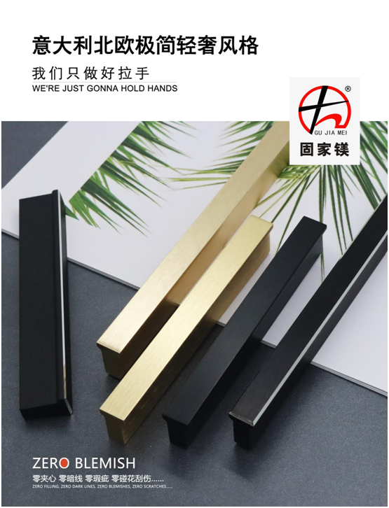 固家鎂五金拉手采用航空純鋁合金,實力加厚,通體圓滑,拉手統一經過防刮手、防撞處理,以行業領先技術實現材質的抗氧化,經久耐用。固家鎂意大利北歐極簡輕奢風格拉手看似簡單隨意,卻在細節處彰顯著藝術美學,瞬間讓柜子的顏值上升幾十個百分點,視覺效果滿分。