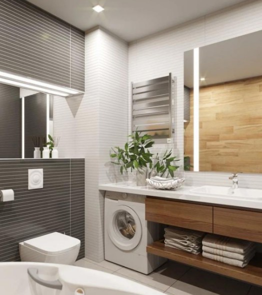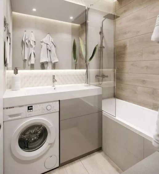 在很多家庭中,洗衣機上方的空間是懸空的。所以最好將洗漱區和洗衣區結合起來。洗衣機上面就是洗漱臺,最大程度地利用好了每一處空間。