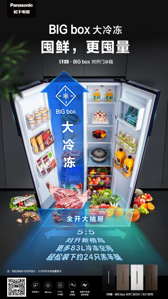 說起關鍵詞「保鮮」、「容量」,松下纖尚 · BIG box對開門冰箱便會出現在面前,570L超大容量,255L冷凍空間,足以應對一家人常見食材兩周的存儲。