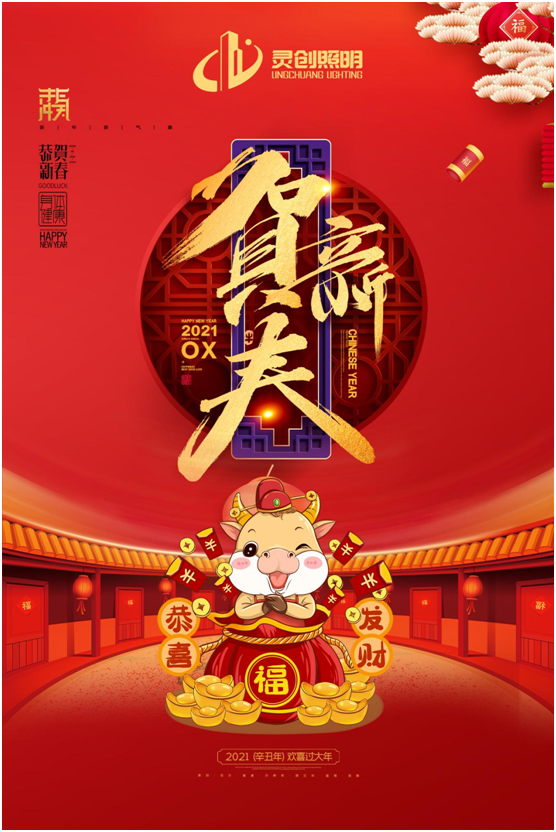 玉鼠辭歲,金牛迎春。伴隨著新春的喜慶氣息,如今我們正昂首闊步地行走在辛丑年的希望大道上,一路鮮花點綴,一路掌聲伴樂。在剛剛過去的庚子年,感恩全體員工及經銷商、合作伙伴、社會各界人士的強大支持,讓靈創照明始終保持著健康、穩步、向上的發展勢頭。在此,特向各位尊敬的靈創家人們、朋友們,致以誠摯的新春問候,祝大家在新的一年里,事業有成,幸福如意,笑口常開,闔家安康!