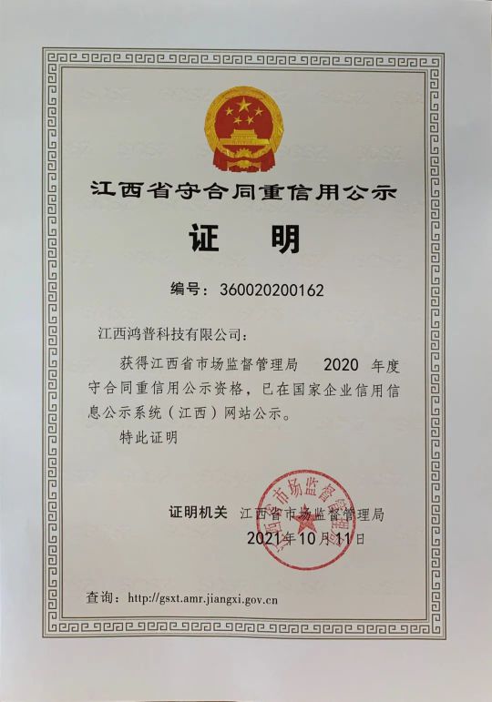 近日,江西省市場(chǎng)監(jiān)督管理局對(duì)2020年度江西省“守合同重信用”企業(yè)進(jìn)行公示,江西鴻普科技有限公司(下文稱(chēng)“鴻普照明”)順利通過(guò)江西省市場(chǎng)監(jiān)督管理局的最終評(píng)審,獲評(píng)“江西省守合同重信用企業(yè)”榮譽(yù)稱(chēng)號(hào),并獲頒榮譽(yù)證書(shū)。
