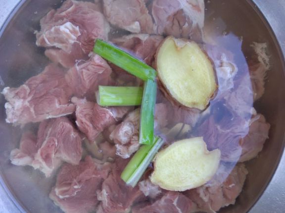 第二步、鍋里倒入適量清水,牛腩冷水下鍋,加入蔥段、姜片、料酒,開大火焯水,撇掉煮出來的浮沫,5分鐘撈出,用溫水沖洗干凈,瀝干水分。