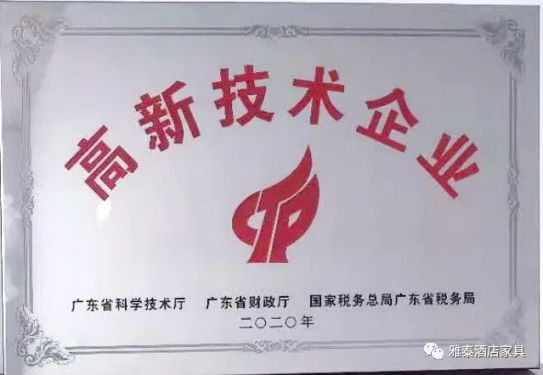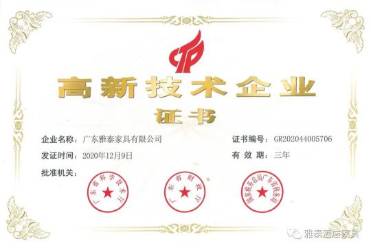 “高新技術企業”認定是政府為支持企業發展而設立的一項權威認定類資質,是我國科技創新企業的一項重要榮譽,對公司在核心自主知識產權、科技成果轉化能力、研究開發的組織管理水平、成長性指標和人才結構的綜合評估和認定,也是對企業科研實力的高度肯定。此次高新技術企業認定,意味著雅泰酒店家具在技術實力、持續創新能力、核心自主知識產權和企業經營管理等方面取得長足進步,獲得了業界和國家權威部門的充分認可,將進一步推動雅泰家具自主創新、自主研發的進程,同時也是雅泰家具發展史上的又一個里程碑!