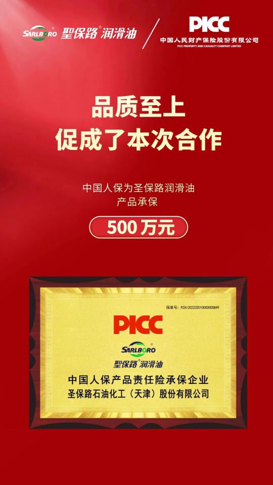 近日,圣保路潤滑油與中國人民保險公司(PICC)正式達(dá)成戰(zhàn)略合作,簽訂產(chǎn)品質(zhì)量保險協(xié)議,圣保路全系產(chǎn)品將獲得PICC的品質(zhì)鑒證與質(zhì)量保障。
