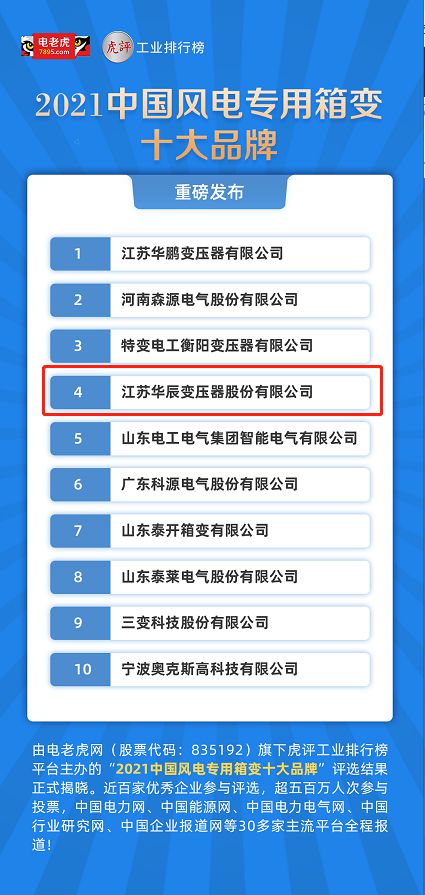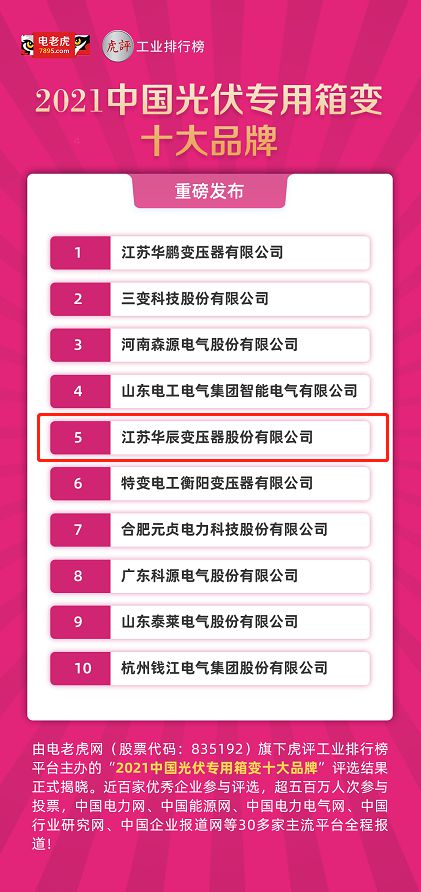 近日,由電老虎網(wǎng)旗下“虎評工業(yè)排行榜”主辦,多家權(quán)威媒體、各級行業(yè)協(xié)會共同發(fā)起的“2021中國光伏專用箱變十大品牌”與“2021中國風(fēng)電專用箱變十大品牌”榜單正式揭曉。江蘇華辰變壓器股份有限公司分別榮登這兩份榜單的第五名與第四名!該系列排行榜在行業(yè)內(nèi)擁有巨大的影響力,傳播廣泛、影響深遠,得到業(yè)界高度認(rèn)同,被譽為中國電力電氣行業(yè)的“金雞百花獎”。