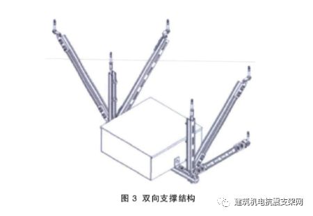 縱向支撐結構所謂縱向支撐(圖 2),是指斜支撐水平投影方向平行于管道軸線。縱向支撐用于消除地震水平荷載中平行于管線方向的荷載,防止管線在地震中整體縱向位移。不同于側向支撐,縱向支撐在系統中設置的數目較少,每個直管段應至少設置一個縱向支撐支吊架,當兩個縱向支撐間距超過設計最大間距,需要按《建筑機電工程抗震設計規范》第 8.2.3條要求間距增設縱向支架。雙向支撐結構綜合了側向支撐和縱向支撐兩種支撐形式特點的支撐結構即為雙向支撐結構,又稱四向支架(圖 3),一般適用于機電管線較多、支架承重較大的情況