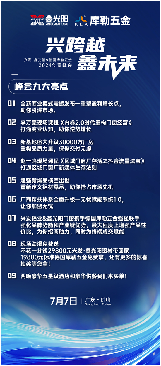 在門窗行業風起云涌的今天,如何抓住機遇,實現跨越式發展?7月6-7日,庫勒五金攜手興發·鑫光陽門窗,共同舉辦“興跨越·鑫未來”財富峰會,為門窗行業注入新的活力與機遇。