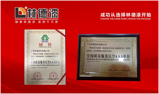 近日,林德漆憑借在綠色涂料行業領域的不斷探索和創新,榮獲由中國名牌產品培育委員會和中國品牌調查統計中心聯合頒發的“全國質量服務信譽AAA單位”榮譽稱號。