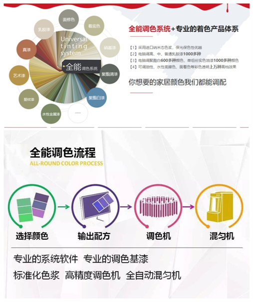 2000年,數碼彩正式推出了中國第一套集內外墻乳膠漆、真漆、聚酯白漆、彩色透明面著色、底著色于一體的全能調色系統,利用數字化電腦調色,可以調配出無數可能性的絢麗色彩,快速而準確地為客戶提供色彩搭配方案。
