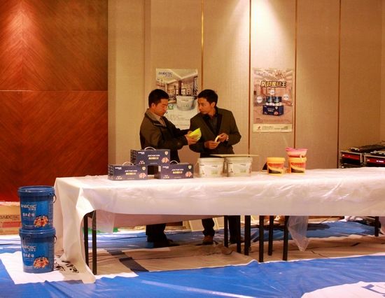 客戶對新產品興趣濃厚,圖為巴德士漆推廣部經理陳少豪在會后為客戶講解巴德士藝術涂料。