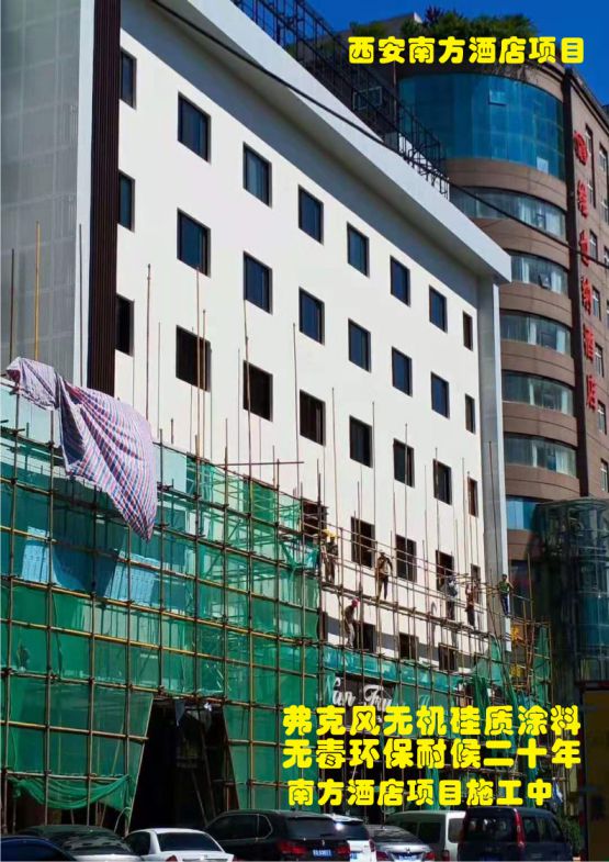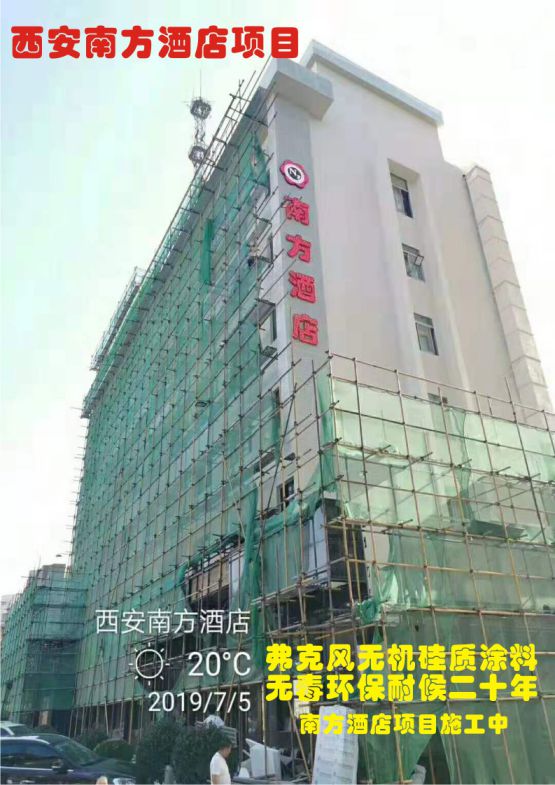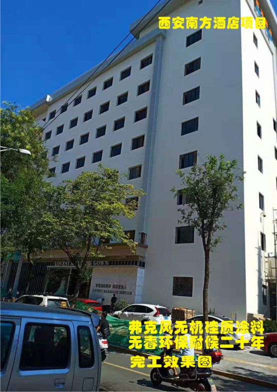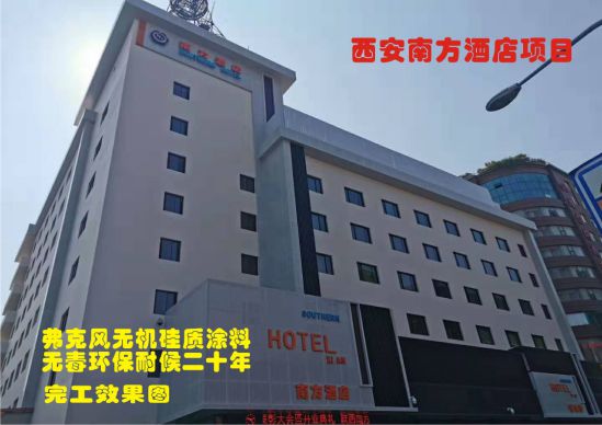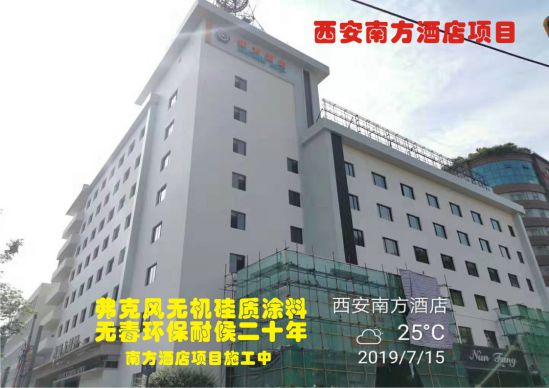 西安南方酒店身為西安著名的酒店,平時客戶量比較大,酒店環境的優劣事關客戶的消費體驗。身為南方酒店的首要 門面,酒店外墻面的美觀非常關鍵,酒店原來的外墻漆歷經長期的風吹日曬,已顯得發霉脫落,翻新勢在必行。既然要翻新,外墻涂料的品質特點一定要信得過,方可一勞永逸。酒店方歷經各個方面對比后選用了無機涂料——弗克風外墻面硅質漆,弗克風外墻面硅質漆有哪些特點可以贏得南方酒店的喜愛呢?