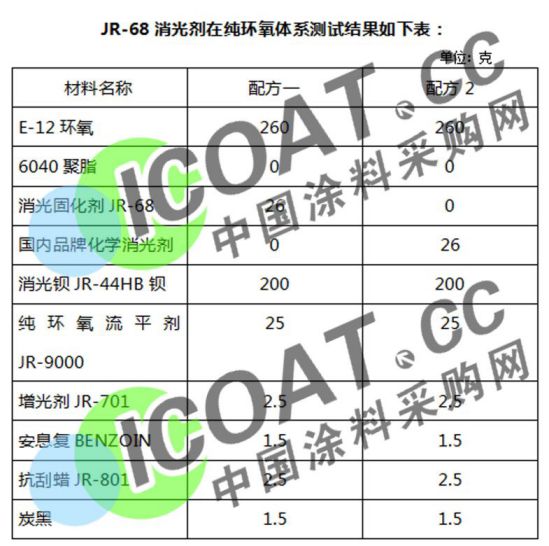 JR-68是最具典型的環咪環氧消光固化劑,是功能性粉末涂料的主要消光固化劑,與環氧搭配,可制備1.5度以下啞光涂料,涂層細膩、無霧影、無閃光點,沖擊性能:正沖:50kg,反沖:40kg;與聚脂樹脂搭配,可調6-30度半光型粉末涂料(適用于國內絕大部分5:5和6:4聚脂樹脂)。