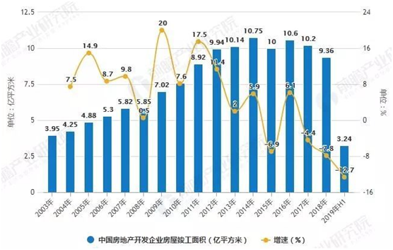 2003-2019年H1中國房地產開發企業房屋竣工面積統計及增長情況