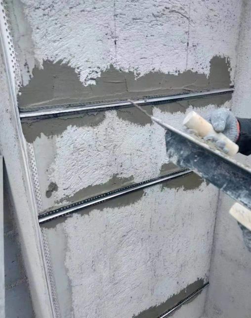 固定好分隔條之后,批刮第二遍外墻抗裂砂漿,干燥后再批刮外墻專用細(xì)膩子(找平),厚度需與線條齊高。