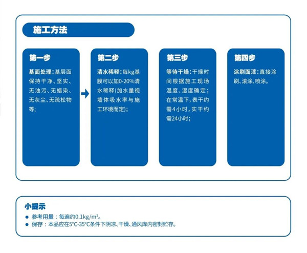 每kg基膜可以加0-20%清水稀釋(加水量視墻體吸水率與施工環(huán)境而定)