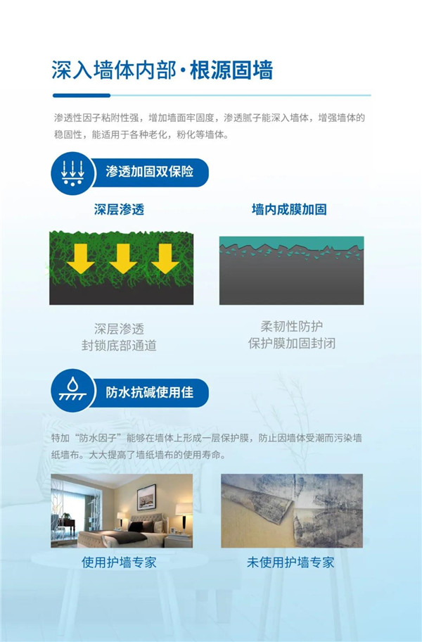 護(hù)墻專家防水基膜特加“防水因子”,能夠在墻體上形成一層保護(hù)膜,防止因墻體受潮而污染墻紙墻布,大大提高了墻紙墻布的使用壽命。