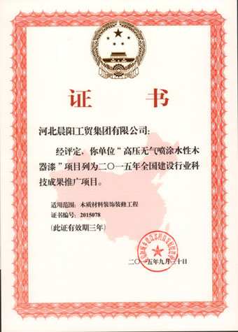 近日,由中國水漆領導者晨陽水漆研發生產的“高壓無氣噴涂水性木器漆”被列入2015年全國建設行業科技成果推廣項目。截至目前,該公司已有3項科技成果獲頒“全國建設行業科技成果推廣項目”證書。