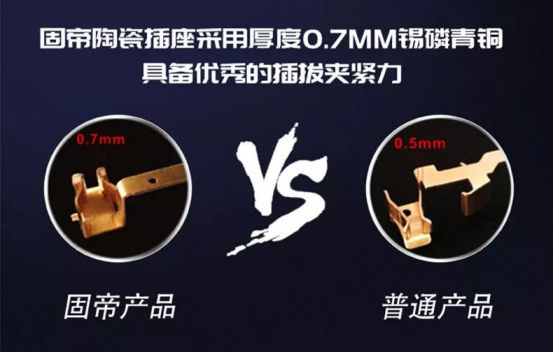 固帝堅持高品質開關定位,一方面從用電安全角度出發,改進插座用材,精選防火耐高溫的陶瓷組件作為后座材料包裹導電銅件,相比傳統材料,具備更好的絕緣性和耐高溫能力;另一方面,固帝陶瓷插座采用0.7MM超厚特制錫磷青銅件,相比市面上的普通插座,能承載更大功率電流,且具備優秀的插拔夾緊力,長久使用不易掉插頭。