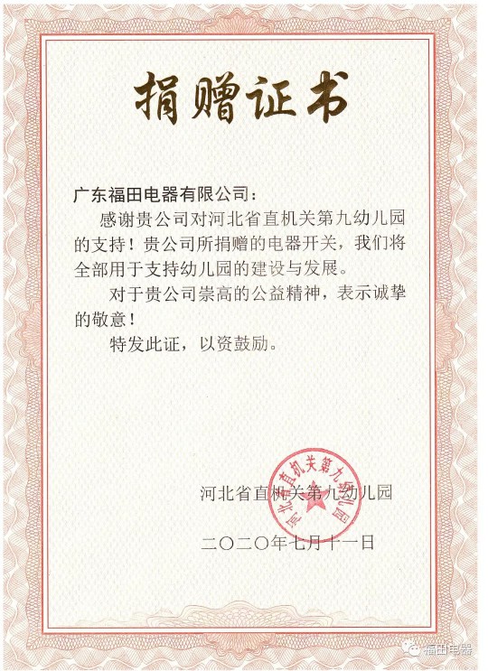 此次福田電器攜手經銷商溫暖在線河北科技服務有限公司,與河北省直機關第九幼兒園多次溝通,達成捐贈意向。