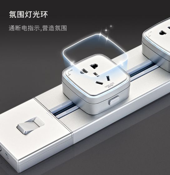 2.金屬材質質感,契合各種裝修風格,配有氛圍燈光環來作為通斷電指示,養眼程度100%;