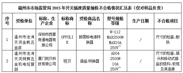 從不合格名單中獲悉,標稱深圳市西蒙奇通電器有限公司生產的一批次“OPPULIE”新國標電源轉換器,被檢出尺寸的檢查、耐熱項目不合格。標稱廈門視貝科技有限公司生產的一批次“視貝”插座/轉換器,被檢出尺寸的檢查、插頭和移動式插座的結構、軟纜及其連接項目不合格。
