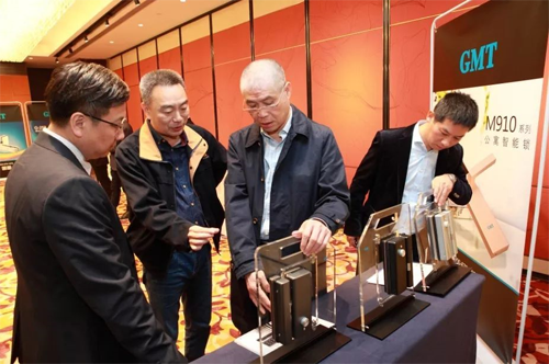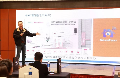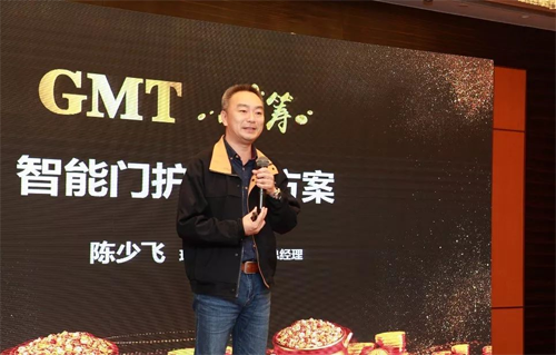 接下來,來自珠海吉門第科技的總經理陳少飛先生為大家帶來主題演講《GMT智能門護解決方案》,并從外觀設計、材料工藝、核心技術、創新功能等全方位地向現場嘉賓介紹了本次新品發布會GMT全新的三大智能鎖系列。