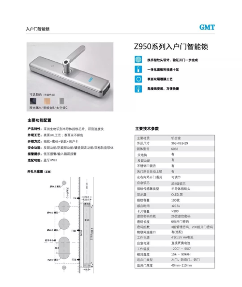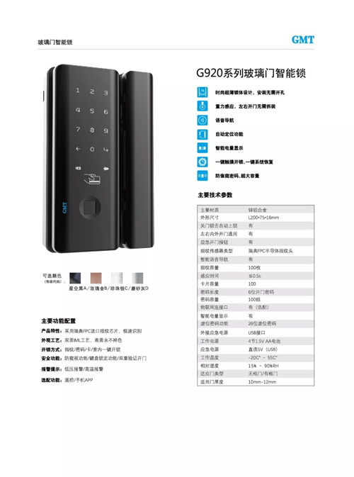 作為GMT智能鎖三劍客之首的GMT G-920玻璃門智能鎖改變傳統插孔鑰匙的諸多不便,讓現代化辦公與商業變得簡單起來。GMT玻璃門智能門鎖采用超薄鎖體設計,兼具外觀的時尚大氣與內核技術的安全扎實,融合指紋、密碼、卡、室內一鍵開鎖多種形式,另有重力感應、自動歸位調整等黑科技加持,讓安全防護走向多方式融合,以滿足更多場景需求。
