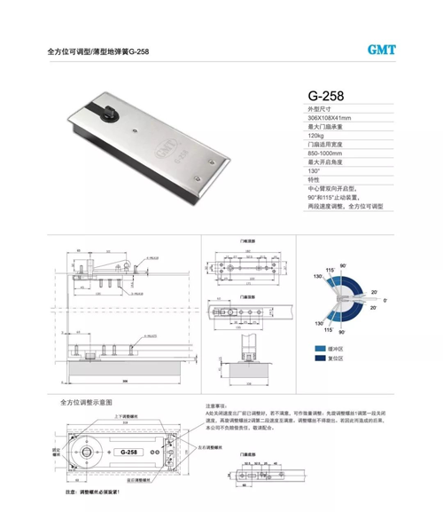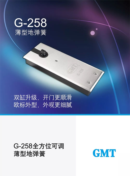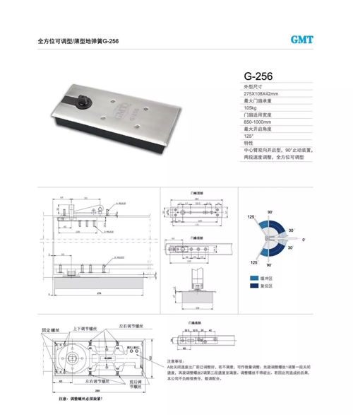 G-256薄型地彈簧采用歐標工藝,打造精湛順滑外觀,與高大上的建筑環境相媲美,更有現代化氣息。產品本身亦是具有全方位調節的實用性功能,最大開啟角度高達125°,最大門扇承重達105kg,是地彈簧界的新選擇。