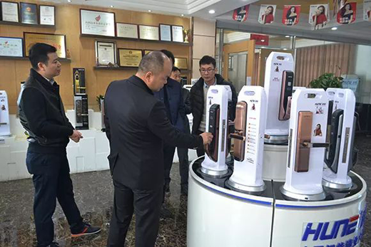 保利一行首先參觀了科裕展廳,對科裕智能鎖的外觀和使用表示高度的認可,認為科裕鈦合金系列智能鎖外觀簡雅大方,手感極佳,符合年輕消費者對簡約風格的時尚追求。