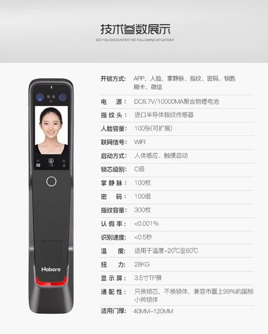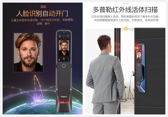 (8)人臉識別開鎖:Hobere-H9擁有三維立體面部快速識別技術,并采近紅外線活體掃描系統,有效辨認出模型、動物、照片等“偽裝術”。