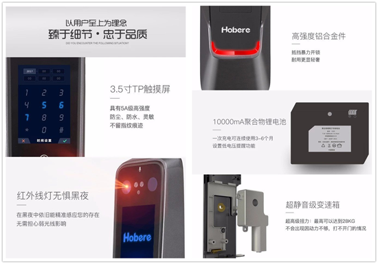 Hobere-H9擁有5A級高強度3.5寸TP觸摸屏,防水、防塵、靈敏,不會留下指紋痕跡;配備紅外線燈,即使在黑夜中也能精準感應用戶的存在;采用高強度鋁合金件,有效抵擋暴力開鎖,更經久耐用;采用10000mA聚合物鋰電池,節約環保,安全可靠,使用壽命長;采用超靜音變速箱,超高級扭力,開門更順暢。